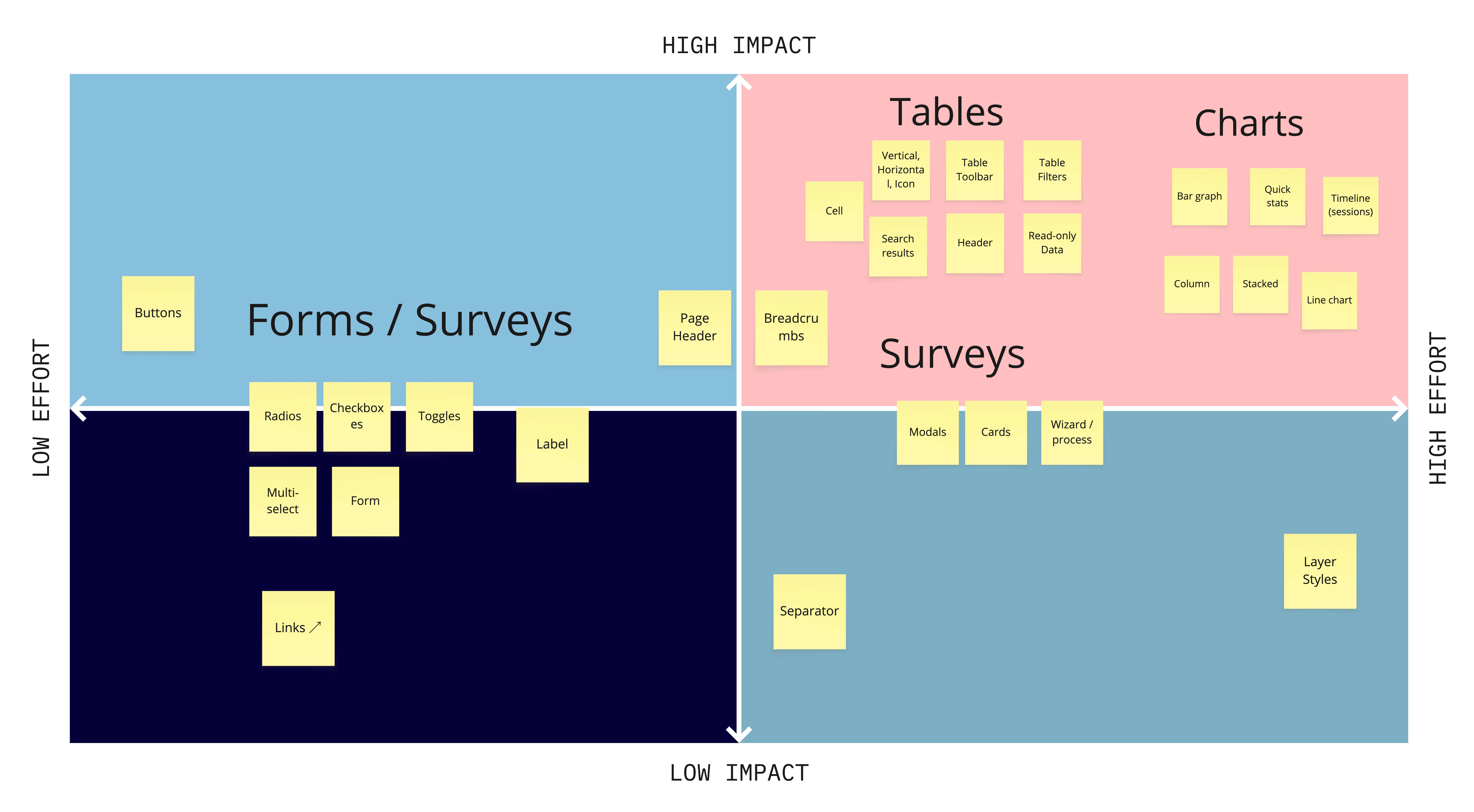 Next were the strategic priorities. For example, we were starting to build dashboards. This was a great opportunity to pull chart components up into the MVP, so that those components were standardized from the get-go, and wouldn’t need to be revisited later.